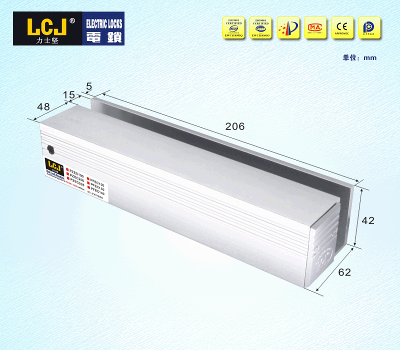 配合電插鎖EC200系列、EC200A系列、EC200B系列、EC200H鎖體,應(yīng)用于8~12mm厚上無框玻璃門(15mm玻璃特定) |